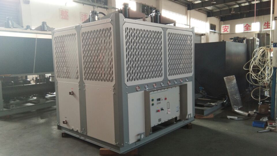 風(fēng)冷式制藥業(yè)用螺桿式防爆冷凍機(jī)通過(guò)風(fēng)扇以空氣為冷凝方式的控溫設(shè)備。