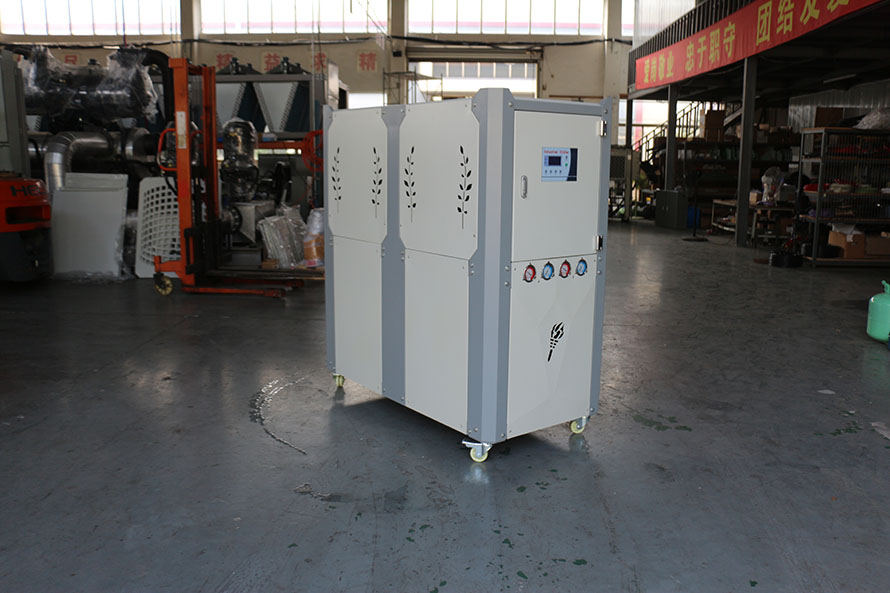 1、風(fēng)冷式吹膜機(jī)冷卻降溫用冰水機(jī),通過風(fēng)扇以空氣為冷凝方式的控溫設(shè)備,有箱式和螺桿式;
