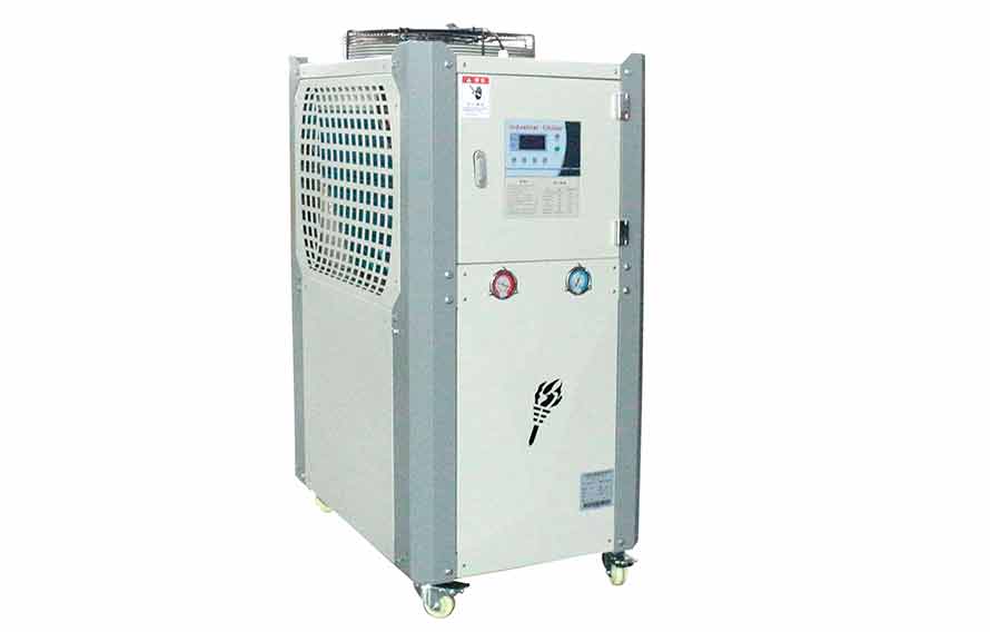 2、風冷式壓塑冷水機,通過風扇以空氣為冷凝方式的控溫設(shè)備,有箱式和螺桿式;